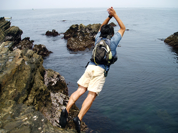 シーカヤックツアー内の様子。沖の島に上陸し高台からジャンプ!